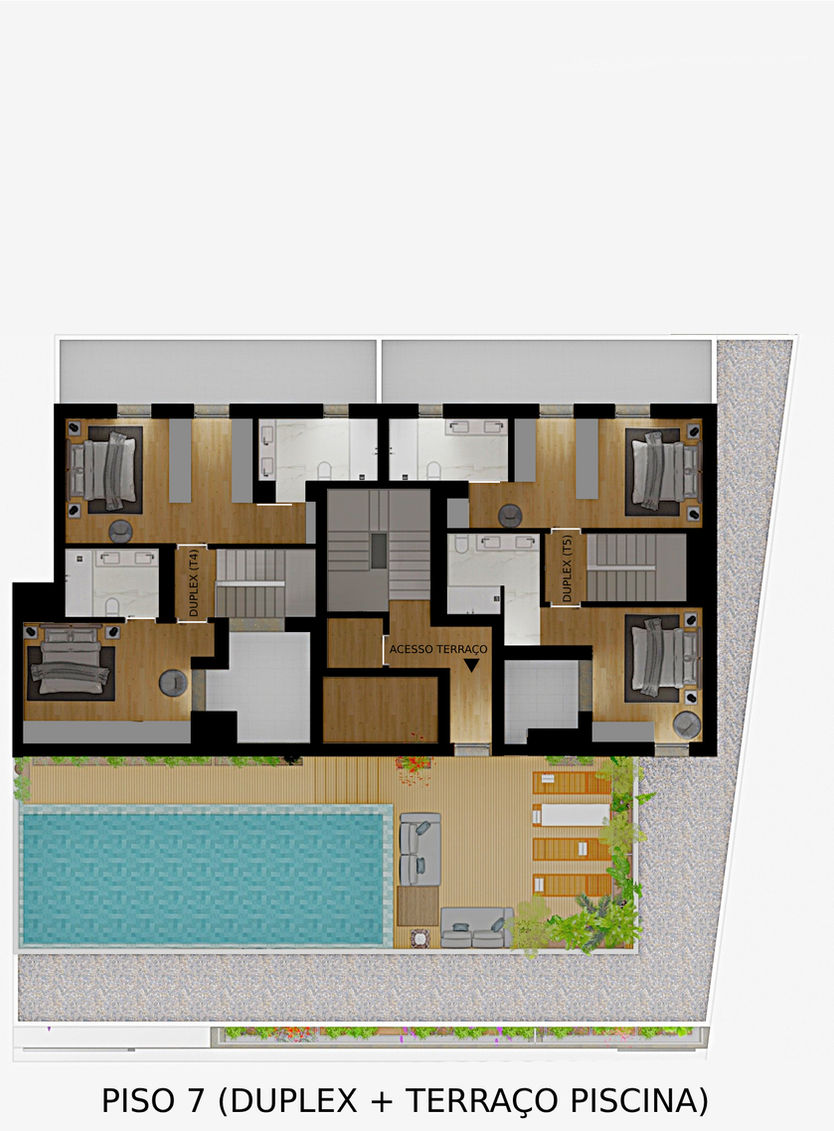 Composto por 20 apartamentos T2, T3, T4 Duplex e T5 Duplex com acabamentos de luxo, garagem em condomínio fechado, com jardim, terraços e um rooftop com piscina e vista panorâmica.